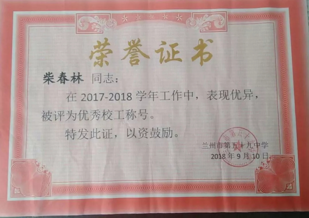 ▲校方給城關(guān)物業(yè)員工頒發(fā)的獎狀