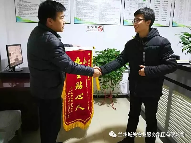 1月14日晚,交大桃;▓@業(yè)委會劉主任代表全體業(yè)主,將一面題有“小區(qū)好管家,業(yè)主貼心人”的錦旗送至項目經(jīng)理梁偉手中,并對城關物業(yè)的服務工作給予了高度的評價和肯定。