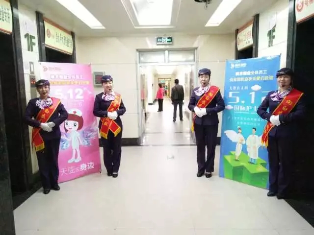 城關(guān)物業(yè)醫(yī)院類各項(xiàng)目部在護(hù)士節(jié)當(dāng)天,在醫(yī)院各主要入口處擺放節(jié)日祝福展架,并向來往的醫(yī)護(hù)人員行禮,向他們送去節(jié)日的祝福。