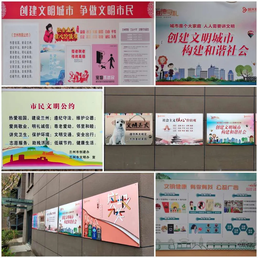 城關(guān)物業(yè)在創(chuàng)文期間加大工作力度,保證環(huán)境整潔,同時積極開展“精神文明”建設(shè)工作,在小區(qū)內(nèi)各顯著位置張貼創(chuàng)文宣傳海報、宣傳展板,專門設(shè)立“蘭州市文明志愿者”崗,為業(yè)主宣傳創(chuàng)文工作。