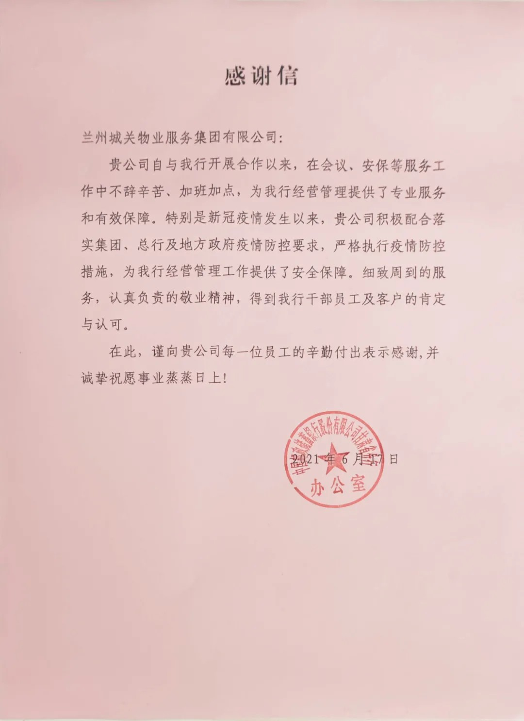 中國郵政儲(chǔ)蓄銀行甘肅省分行是城關(guān)物業(yè)服務(wù)的眾多項(xiàng)目之一,自合作以來,我們在會(huì)議、安保等服務(wù)工作中為甲方提供了專業(yè)服務(wù)和有效保障;尤其在疫情期間,我們嚴(yán)格執(zhí)行疫情防控措施,為銀行的正常運(yùn)轉(zhuǎn)提供了安全保障。我們認(rèn)真負(fù)責(zé)的工作態(tài)度和不辭辛苦、加班加點(diǎn)的敬業(yè)精神得到了銀行員工及服務(wù)客戶的肯定與認(rèn)可。